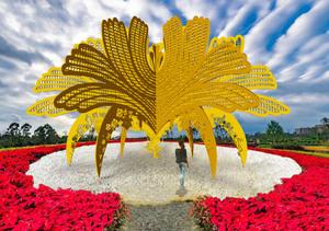 【設(shè)計(jì)思路】景觀為金芙蓉造型,由六個(gè)芙蓉花切面組合而成,恢弘壯觀?;ㄍ型夥瓘亩衅鹫麄€(gè)造型?;ㄍ袃?nèi)側(cè)鏤空雕刻了四季繁花掩映中的成都代表性的古建筑剪影,中間祥云繚繞、仙樂(lè)飄飄,芙蓉花仙子翩翩起舞,構(gòu)建出吉祥歡樂(lè)的古芙蓉城盛景。