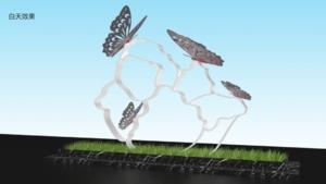 【設(shè)計(jì)思路】造型依托芙蓉花的外輪廓,做成鏤空的工藝,展現(xiàn)在空間當(dāng)中,每個(gè)花瓣上都立有一只粉色通透的蝴蝶,就像亭亭玉立的美人一樣,讓人聯(lián)想到涉江采芙蓉中的美人曼妙身姿;夜晚降臨,花朵與蝴蝶在柔和的燈光下閃閃動(dòng)人。
