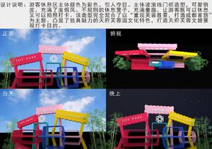 【設(shè)計(jì)思路】游客休息區(qū)主體顏色為彩色,引人奪目。主體波浪線門框造型,可愛(ài)俏 皮,充滿了度假風(fēng)。不規(guī)則的休息凳子,充滿童趣,讓游客既可以休息 又可以拍照打卡。該造型完全契合了以‘ 重現(xiàn)芙蓉勝景, 打造成都首旅 為主題。凸顯了獨(dú)具魅力的天府芙蓉園文化特色,打造天府芙蓉文旅景觀打卡目的。