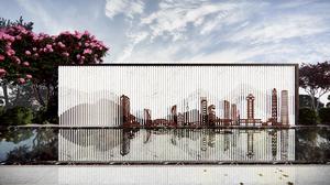 【設(shè)計(jì)思路】“印象天府”景墻以白色為主,隱隱有山水附于墻面,似水波又似云霧,景墻前設(shè)置了前后錯(cuò)落的藝術(shù)裝置,該裝置提取了成都著名的景點(diǎn),以剪影的方式展現(xiàn),整體看去裝置仿佛處于山水之間,宛如一幅畫卷。景墻設(shè)置在鏡面水體之中,是考慮了成都是“天府之國(guó),上善之都”,自古就與水有因緣。這樣與周圍的水、植物相結(jié)合也多了一份寧?kù)o,給予游人一種心靈上的安定。