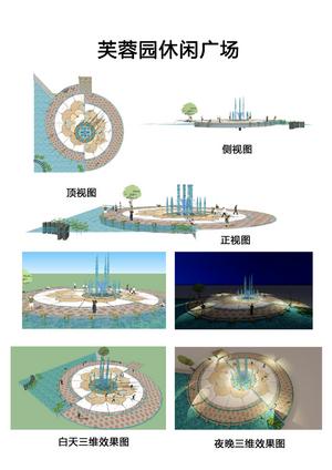 【設(shè)計(jì)思路】底座以芙蓉花為原型做出了層次感十足的造型,其中設(shè)置了水域、噴泉裝置和五彩射燈,上部空間用鋼架搭 建出一個(gè)像花蕊的形狀,上面按間隙安置變色射燈。搭建出可以令人駐足觀望的標(biāo)志景觀。