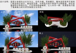 【設(shè)計(jì)思路】造型主體顏色以紅色為主,白色為輔,簡(jiǎn)單醒目。整體造型采用不規(guī)則門框加亮燈設(shè)計(jì),富有層次感。中間亮點(diǎn)設(shè)計(jì)來(lái)自于川劇臉譜,現(xiàn)代的 造型結(jié)合傳統(tǒng)文化,產(chǎn)生奇妙的碰撞感,讓人耳目一新。該造型也凸顯 了獨(dú)具魅力的天府芙蓉園文化特色。