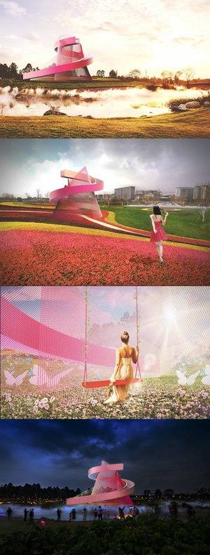【設(shè)計(jì)思路】這個(gè)標(biāo)志性景觀由暸望塔,金屬屏風(fēng),以及位于中心的秋千三部分組成。螺旋形上升的“塔”象征著成都人不斷創(chuàng)新創(chuàng)造的精神以及無(wú)限的未來(lái)。人們可以沿著坡道緩步登塔,步移景異,賞芙蓉園花海盛景。金屬屏風(fēng)則提取了芙蓉花花瓣的曲線和脈絡(luò)紋理進(jìn)行設(shè)計(jì),似透不透,引起人們的好奇而走進(jìn)裝置之中。漸變的顏色則反映了芙蓉花花色一日三變的特征。位于裝置中心的紅色秋千讓人們想起后蜀帝孟昶與“花蕊夫人”的愛(ài)情故事。人們可以坐在中間的秋千上拍照,小憩。