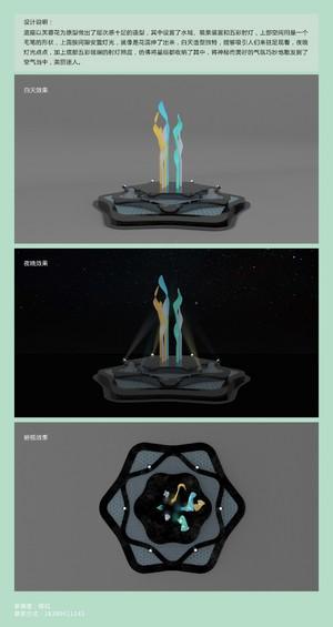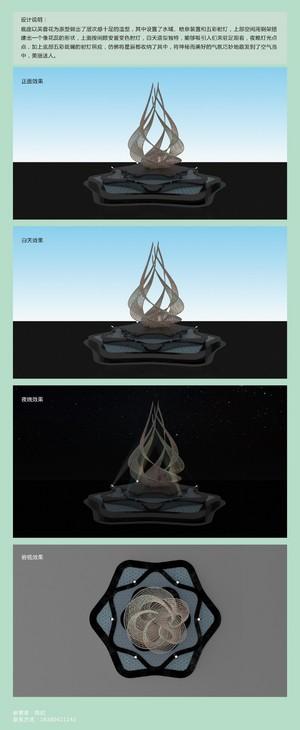 【設(shè)計(jì)思路】底座以芙蓉花為原型做出了層次感十足的造型,其中設(shè)置了水域、噴泉裝置和五彩射燈,上部空間用環(huán)形鋼架搭建出一個(gè)鏤空造型,上面按間隙安置燈光,中間部分就像是芙蓉花的花骨朵,從上像下看就像芙蓉花盛 開(kāi)的樣子。白天造型獨(dú)特,能夠吸引人們來(lái)駐足觀看,夜晚燈光點(diǎn)點(diǎn),加上底部五彩斑斕的射燈照應(yīng),仿佛 將星辰都收納了其中,將神秘而美好的氣氛巧妙地散發(fā)到了空氣當(dāng)中,美麗迷人。