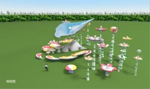 【設(shè)計(jì)思路】“芙云”主體造型是一朵水滴狀的云飄在芙蓉花上的定格瞬間,周圍輔以一片花團(tuán)錦簇的芙蓉林。芙云與網(wǎng)絡(luò)用語(yǔ)“浮云”同音,有云淡風(fēng)輕的含義。云朵通體是不銹鋼鏡面材質(zhì),映射著天空中 的白云和星空,游客可以躺在花瓣.上看看天空,放松身心享受片刻寧?kù)o。大嘴里有一一個(gè)滑梯入口, 從云朵后部滑出,增強(qiáng)了娛樂(lè)互動(dòng)性。