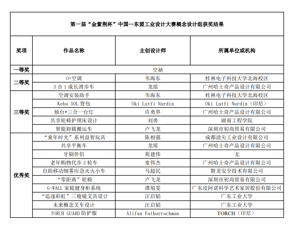 從11月5日至12日,第一屆“金紫荊杯”中國(guó)—東盟工業(yè)設(shè)計(jì)大賽經(jīng)過(guò)初評(píng)、終評(píng)兩輪評(píng)選,評(píng)審工作現(xiàn)已經(jīng)圓滿(mǎn)結(jié)束。在兩輪評(píng)審中,來(lái)自中國(guó)和東盟國(guó)家的五位專(zhuān)家評(píng)委根據(jù)創(chuàng)意性、實(shí)用性、美觀性、經(jīng)濟(jì)社會(huì)價(jià)值和主題契合度5個(gè)標(biāo)準(zhǔn)對(duì)參賽作品進(jìn)行推薦和評(píng)分,并在廣西柳州市公證處的監(jiān)督下,進(jìn)行現(xiàn)場(chǎng)觀看實(shí)物作品(產(chǎn)品設(shè)計(jì)組)、評(píng)分和現(xiàn)場(chǎng)評(píng)議,最終選出本次大賽獲獎(jiǎng)作品(45件)?,F(xiàn)將獲獎(jiǎng)名單公示如下: