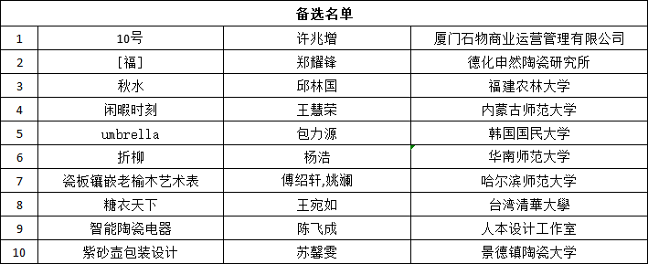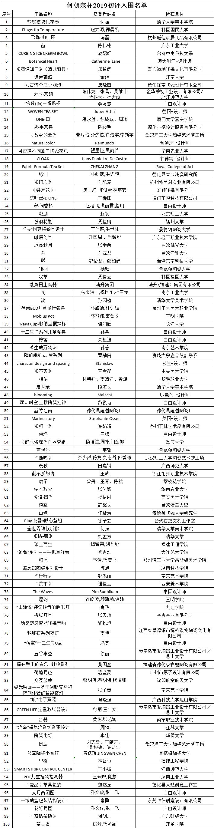 請(qǐng)入圍參賽者(含備選名單)保持郵箱、短信、電話暢通,注意查收由組委會(huì)發(fā)放的賽事通知,根據(jù)“何朝宗杯”2019中國(德化)陶瓷工業(yè)設(shè)計(jì)大賽評(píng)審細(xì)則,于收到通知即日起寄送實(shí)物或作品模型至組委會(huì)辦公室,特殊情況可根據(jù)郵件具體要求向組委會(huì)說明情況。