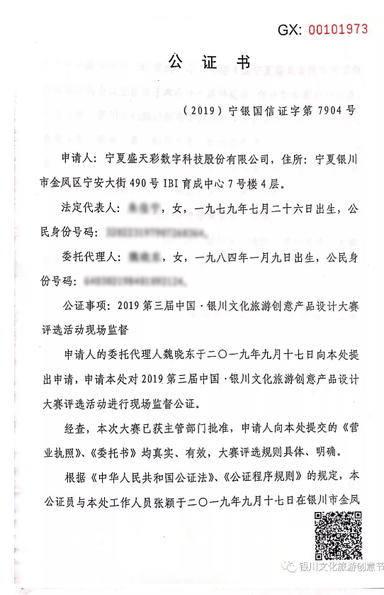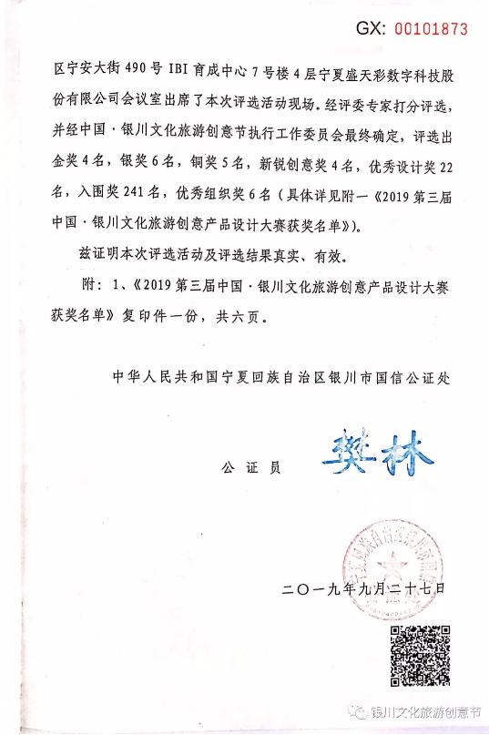 本次大賽評選于2019年9月17日在寧夏盛天彩數(shù)字科技股份有限公司四樓大賽組委會工作室評選完畢,經(jīng)5位專家評審、銀川國信公證處人員公證,最終評選結(jié)果確認如下: